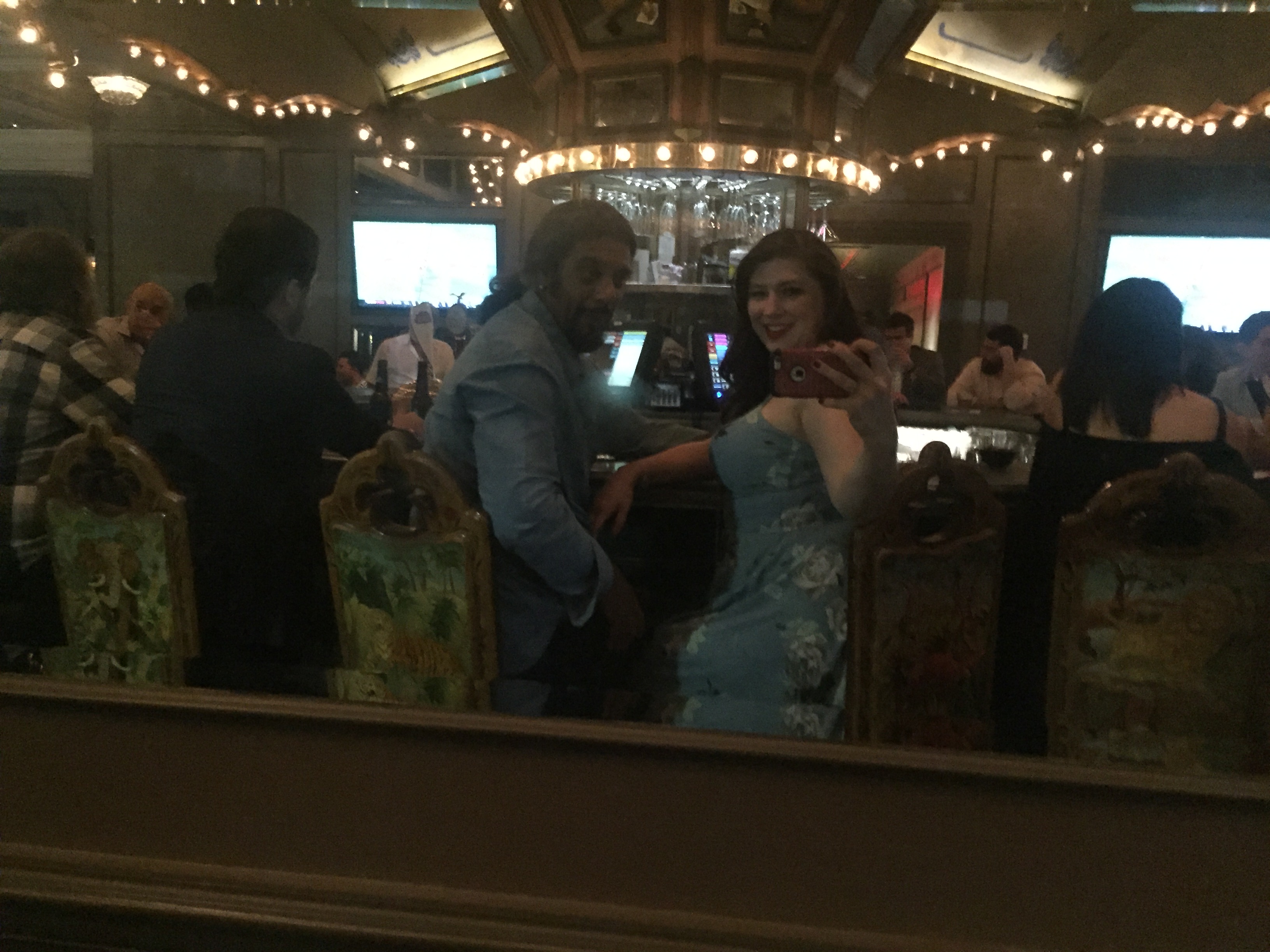 We were lucky enough to get seats at the bar right away. The carousel bar is exactly like it sounds. The bar itself makes a full rotation every 20 minutes. I had the bourbon milk punch. It was incredible. It was really hard to get good pics but the best one of both of us was this one we snapped in the side mirror as we went by. You’ll find it opposite the tv’s if you need to get a selfie with some of the carousel in them. The ones others tried to take were comical and unflattering. Ha ha. The carousel kept turning slowly too which was super funny.